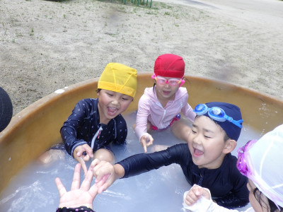 みんなで園内で遊んだ後は、暑かったので、いつものプール?を園庭に出して水遊びもしました。