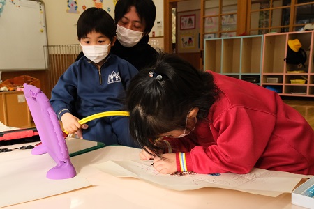 5年生は3・4教室にいて何やら相談中。1・2年生も切り抜いたり色を付けたりして製作中です。