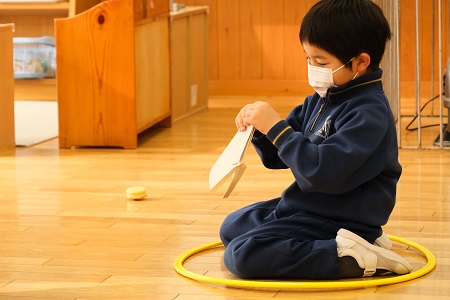 飛ばし方のコツをつかめば、部屋の端から端まで飛ぶようです。あっという間に、飛ばし合い競争となりました。