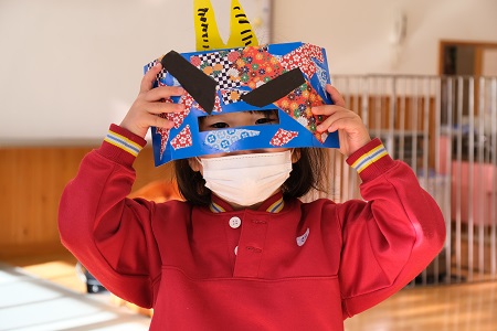 前半は、絵本「おにばらいのまめまき」の読み聞かせで、節分に関わるお話を聞き、後半は鬼退治の豆まきをしました。