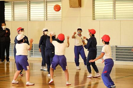 互いに自己紹介をした後、平均台を使ったジャンケンゲームやバスケットボールをしました。