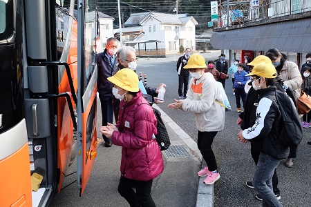 1~5年生や先生方の見送りを受け、元気に出発です。