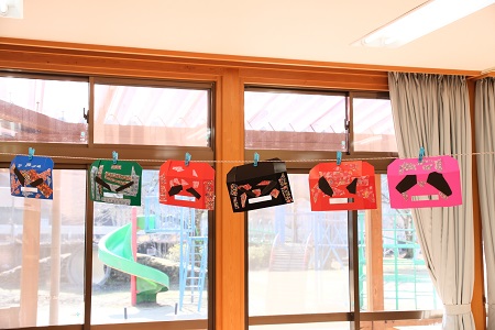 教室には、自分で作った鬼のお面がありました。来週木曜は節分。今年の鬼さんも怖い?